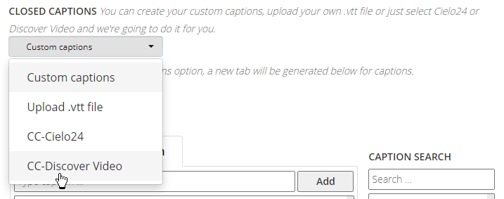 From the video edit page, scroll down to the section where it says Closed Captions. For manual captions, make sure that either "CC-Discover Video" or "CC-Cielo24" is selected in the dropdown menu accordingly.