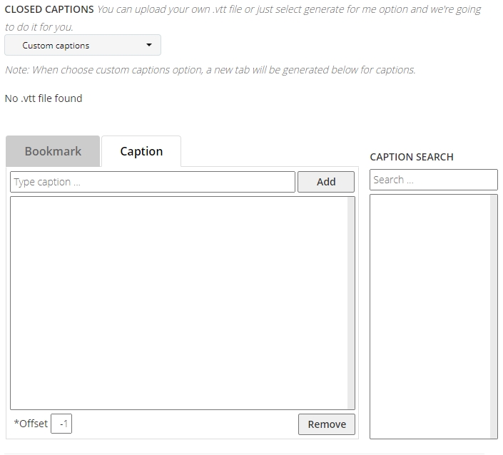If you already have a caption file in VTT format (file extension ".vtt"), instead of typing in the captions manually, you can upload the VTT file and attach it manually to the video by selecting Upload VTT instead of Custom Captions in the dropdown field. Then you can find your VTT file and upload it to attach it to the video.